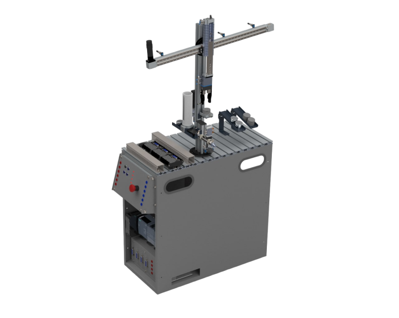 Подъемно-транспортный модуль предназначен для захвата и перемещения заготовок и корпусов. Модуль состоит из двухосевого манипулятора, обеспечивающего перемещение захвата вдоль осей x и z.